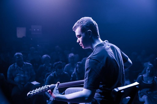 keyboard, piano, ukulele, drums and singing, in a relaxed, informal setting.